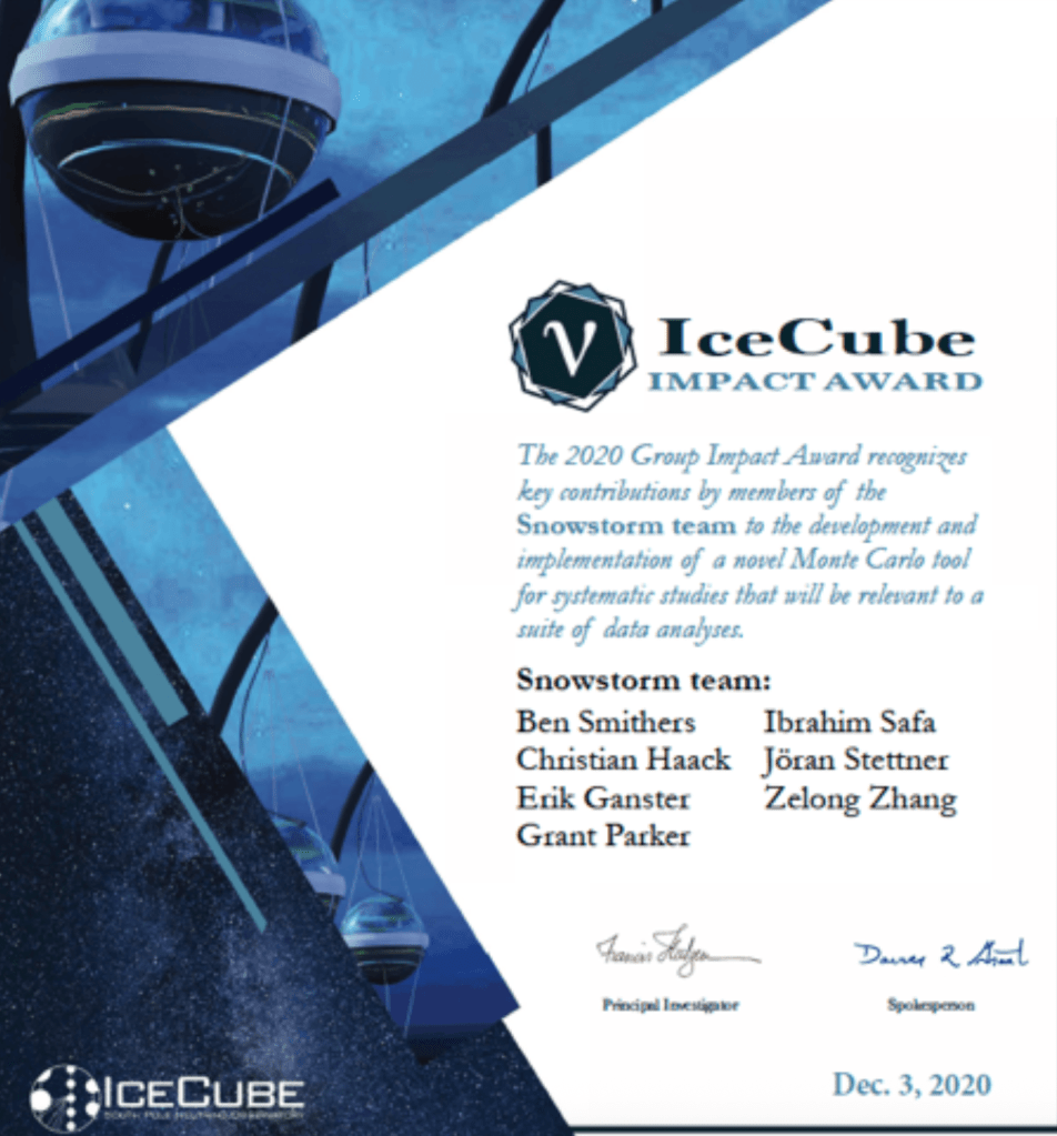 - Grant Parker, Ben Smithers, and Ibrahim Safa (grad, grad, alum): IceCube Impact Award